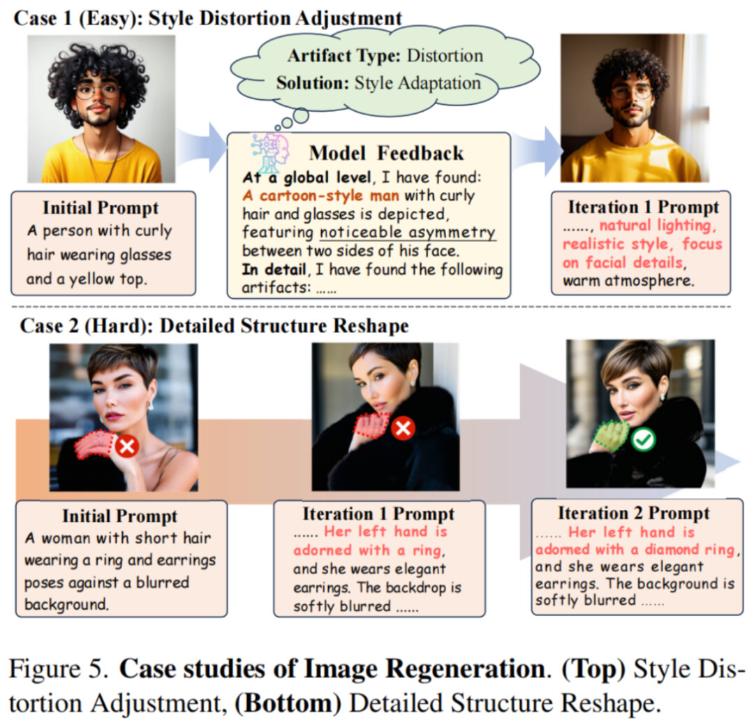 作者指出,现有生成图片中的伪影部分来源于提示词的模糊。利用 LEGION 的异常解释文本,对全局提示词进行多轮细化后再重新生成能够有效修复一些缺陷,例如能对图片进行现实风格迁移、结构细节调整等。