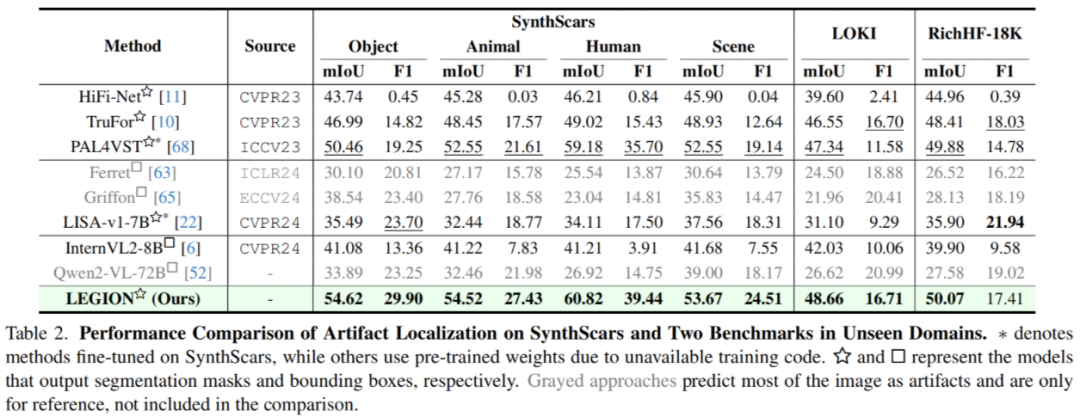作者指出,现有的一些通用多模态大模型,如 Qwen2-VL 在面对此任务时倾向于预测图片的绝大部分(有时是整张图片)为伪影,这是毫无意义的,这说明了现有 MLLMs 缺乏相关知识和能力。
