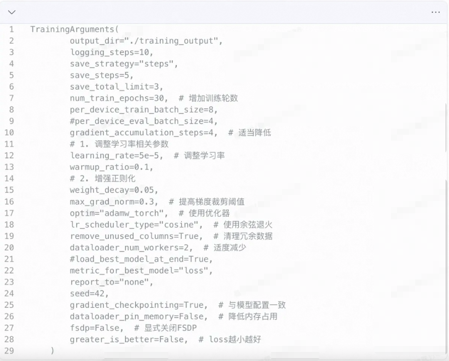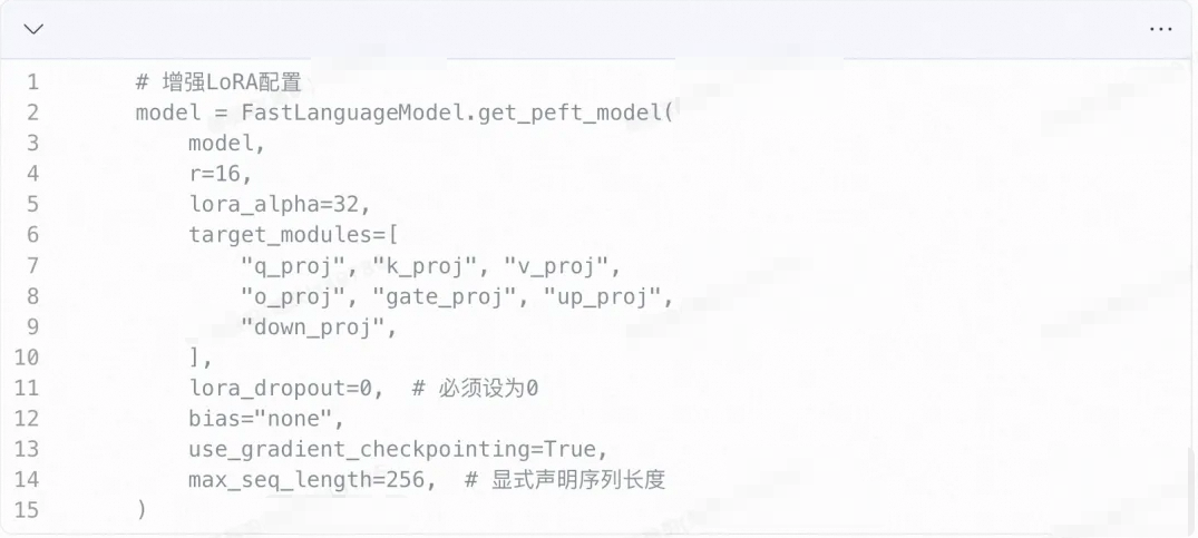 可以通过unsloth的FastLanguageModel.get_peft_model方式,进行Lora微调配置,其中的配置参数,主要考虑以下几方面:
