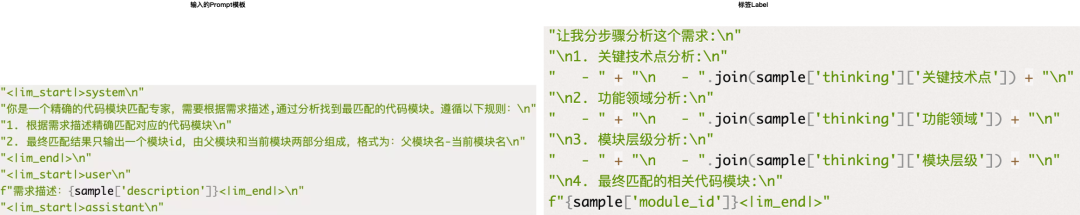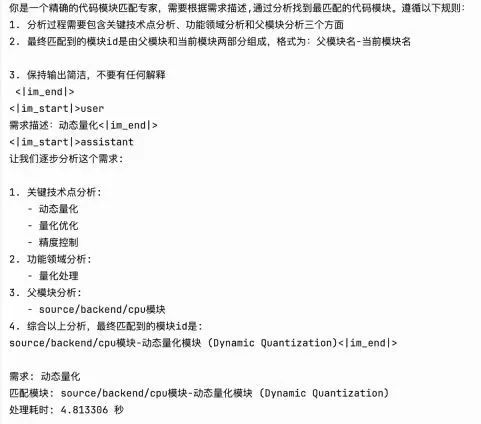 从上述可以看出,明确了给到大模型的指令,清晰说明任务要求,并进行了上下文限定,聚焦模块匹配场景;同时,标签Label中包含思考的过程和最终的模块输出,结构化的输出格式方便解析,其中的thinking字段包含高质量的思考过程,包括:关键技术点的详细分析,功能领域的准确归类,以及模块层级的清晰划分。