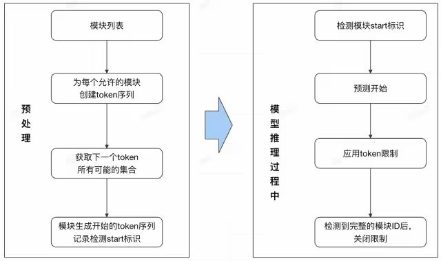 对模型输出的结果,推理时进行了模块列表范围控制,确保模型只生成符合模块ID格式的输出。
