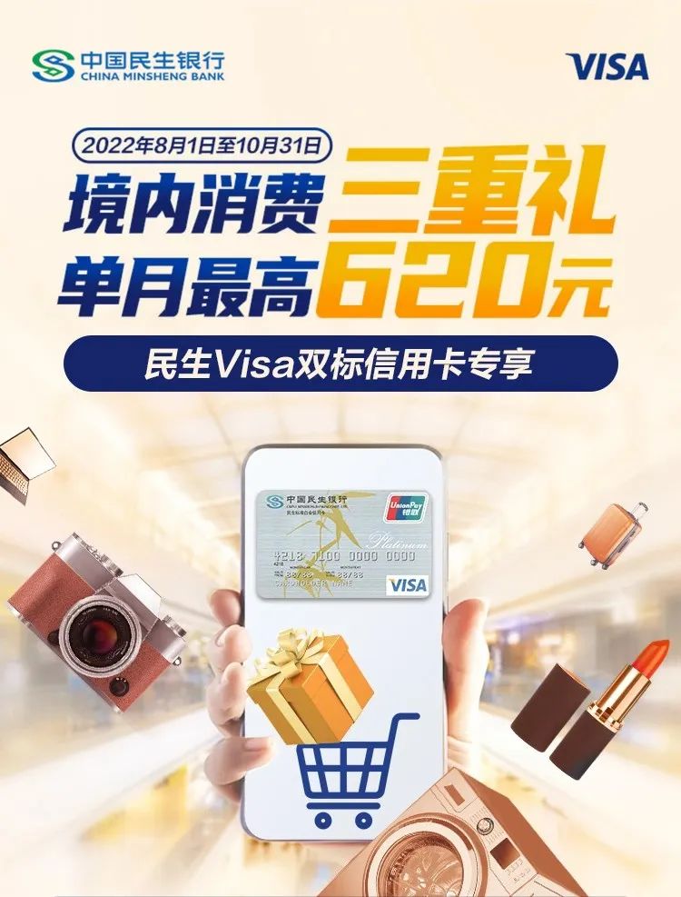 如果你想参加这个活动的话,狗熊推荐你刷民生的 Visa 双标卡,可以顺便叠加两个活动。首先是民生 Visa 双标卡专属的「境内消费三重礼」活动: