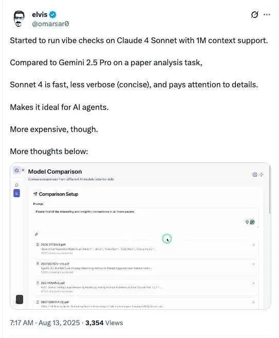 事实上,在此之前,Gemini 和 OpenAI 已率先推出百万 token 级模型。其中,Gemini 早已实施类似分级,Gemini 2.5 Pro 在 200K 以下的价格为 $1.25 / $10,以上则为 $2.50 / $15。从实际效果来看,有用户表示,Sonnet 4 相较于 Gemini 2.5 Pro,响应更快、表达更简洁,同时对细节把握更到位,非常适合用作 AI 代理,缺点就是价格太贵。