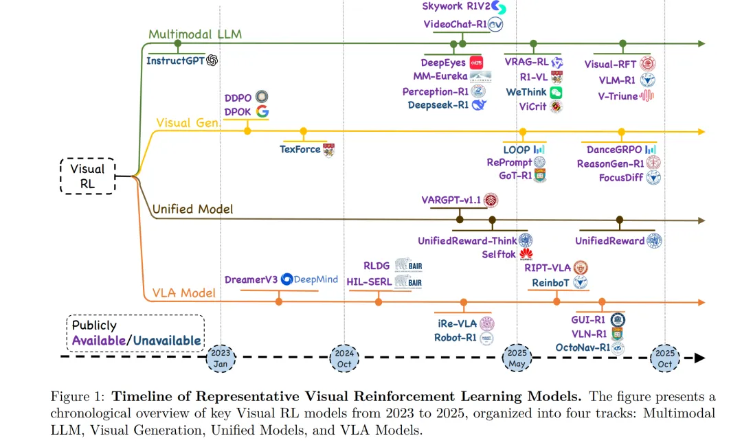 近年来,受 LLM 成就的启发,研究界对将这些在 LLM 上取得成功的 RL 方法扩展至多模态大模型产生了爆炸性兴趣,包括视觉-语言模型(Vision-Language Models,VLM)(Zhou 等,2025a;Zheng 等,2025;Zhang 等,2025f)、视觉-语言-动作模型(Vision-Language-Action,VLA)(Lu 等,2025b;Tan 等,2025b;Luo 等,2025;Yuan 等,2025b)、基于扩散的视觉生成模型(Fan 等,2023b;Black 等,2023;Zhou 等,2025c)以及统一多模态框架(Mao 等,2025;Wang 等,2024b;2025a)(如图 1 所示)。例如,Gemini 2.5(DeepMind,2025)等多模态模型利用 RL 来对齐视觉-文本推理过程,从而生成具有更高语义一致性且更契合人类判断的输出。同时,集成视觉与语言并生成面向动作输出的 VLA 模型,也已采用 RL 来优化交互式环境中的复杂序列决策过程,在 GUI 自动化(Yuan 等,2025b;Shi 等,2025)、机器人操作(Lu 等,2025b)以及具身导航(Kim 等,2025)等任务中显著提升了特定任务性能。