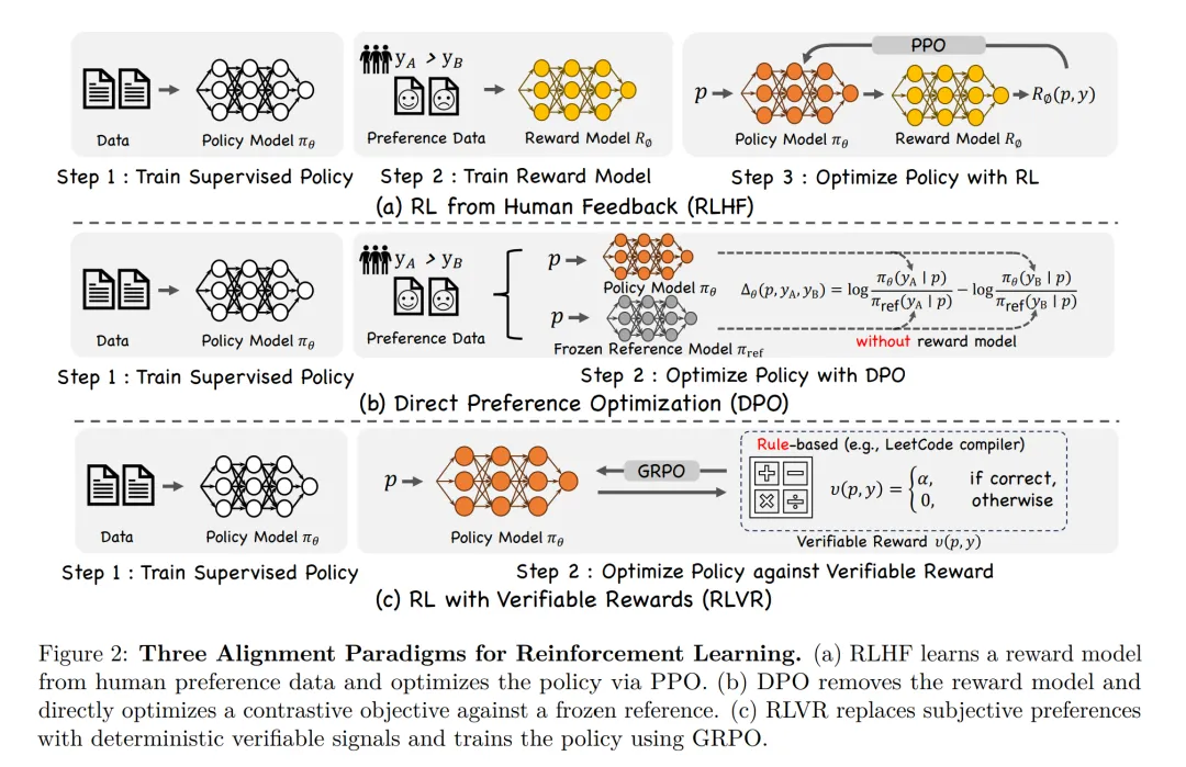 强化学习(Reinforcement Learning,RL)在大型语言模型(Large Language Models,LLMs)领域取得了显著成功(Jaech 等,2024;Rafailov 等,2023),其中最具代表性的范式包括基于人类反馈的强化学习(Reinforcement Learning from Human Feedback,RLHF)(Ouyang 等,2022)以及诸如 DeepSeek-R1(Guo 等,2025a)等创新框架。这些方法显著增强了 LLM 的能力,使生成结果更贴近人类偏好,并赋予其通过单纯监督学习难以获得的细腻、复杂的推理与交互能力。