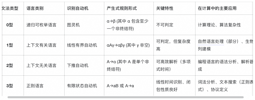了解谱系结构,可以了解到语言表达能力与计算可追踪性之间的矛盾,当规则的约束增强时(从0型走向3型),语言的表达范围收窄,但其分析、解析和验证的难度显著降低。反之,当约束放宽时,语言变得无所不能,但其行为也变得不可预测。基于乔姆斯基谱系,语言的形式化程度可被定义为,一种语言的产生式规则受约束的程度,该程度决定了其在可预测性、可验证性和计算可追踪性谱系中的位置。更高的形式化程度(如3型文法)意味着更严格的规则、更弱的表达能力,但具备高度的可预测性和高效的处理能力。更低的形式化程度(如0型文法)则意味着极大的表达能力,但以牺牲可预测性和可验证性为代价。