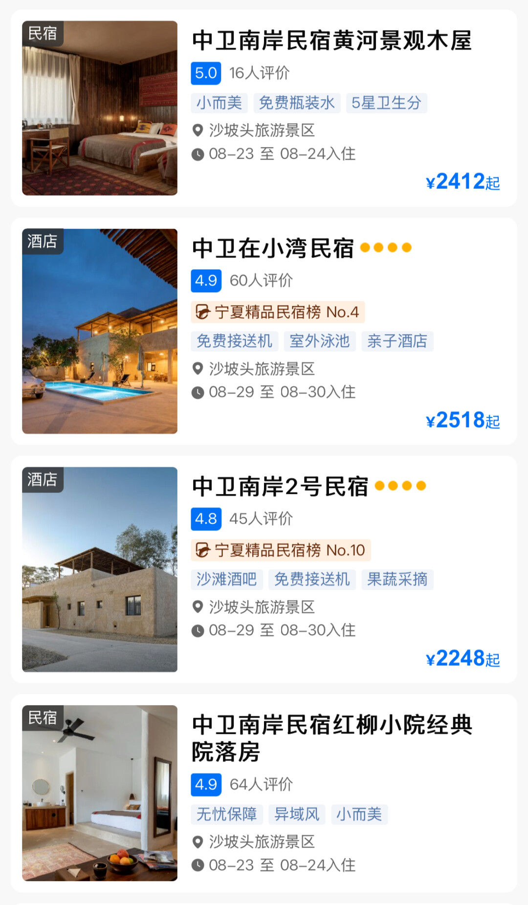 赠送的1晚可在南岸红柳小院、南岸2号、在小湾和黄河景观木屋,4选1。四家民宿的价格并不便宜,旺季2000+,淡季也要1000左右。