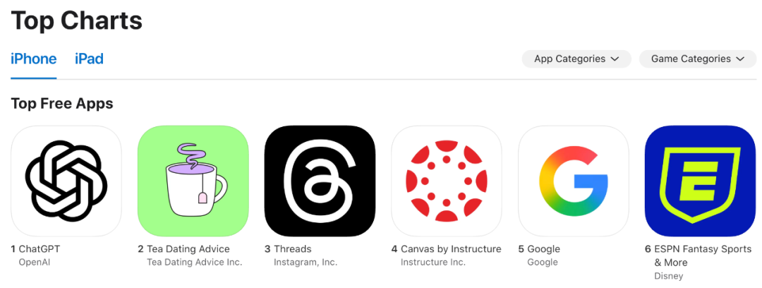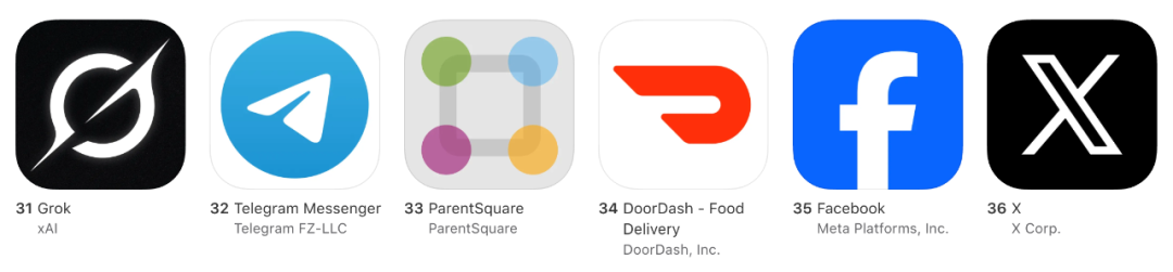 我们搜索发现,在苹果 App Store 最新的免费 App 应用榜单中,「ChatGPT 排在首位,而 xAI 和 X 分别排在了 31 和 36 位。」