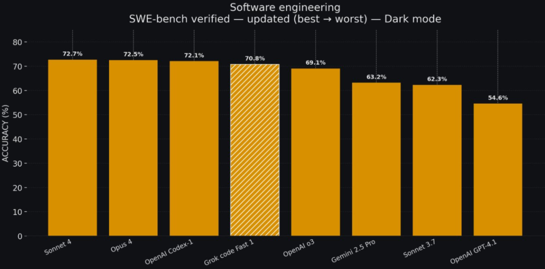 在 SWE-Bench-Verified 的完整子集测试中,grok-code-fast-1 使用内部测试工具获得了 70.8% 的得分,目前它在这个位置: