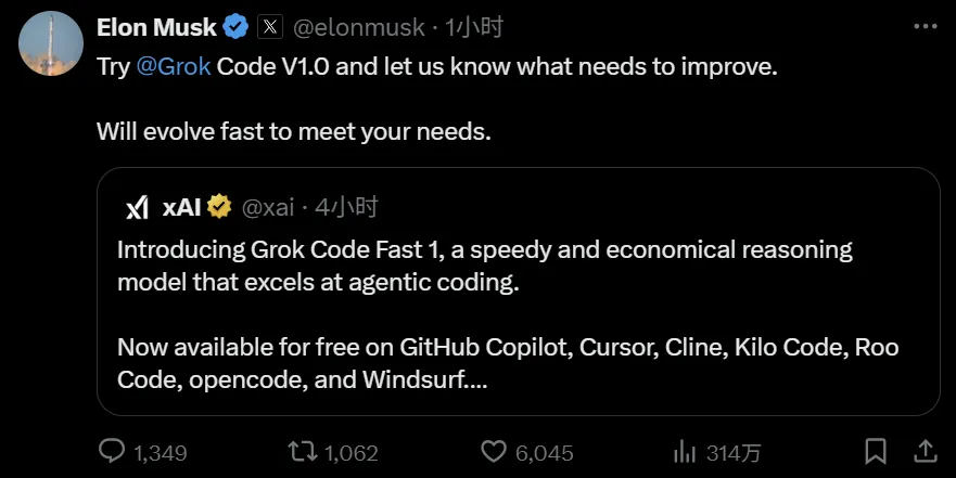 本周四,马斯克的 xAI 正式推出了旗下的最新代码模型 Grok Code Fast 1。