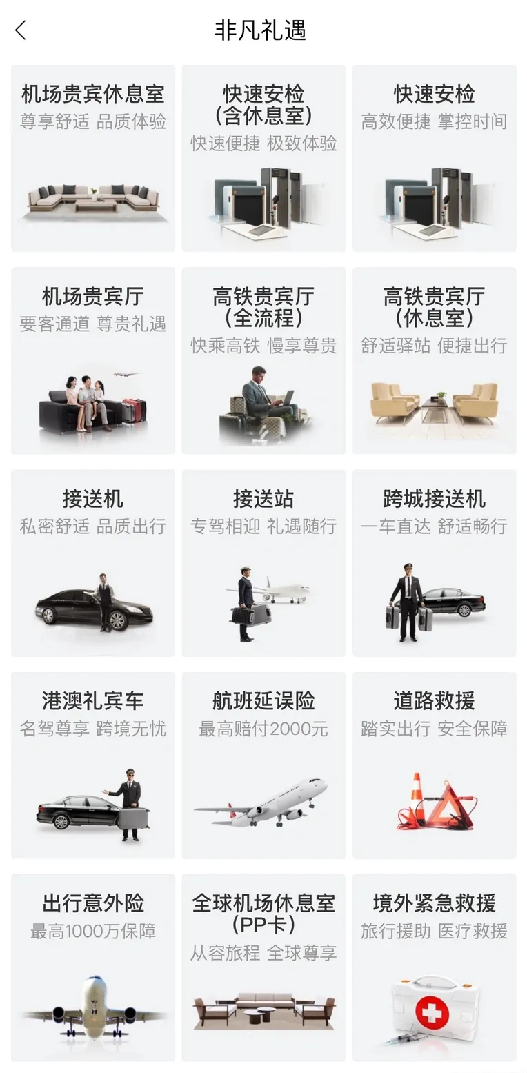 面向钻石卡、无限卡新增跨城接送机、港澳礼宾车“非凡礼遇”权益。