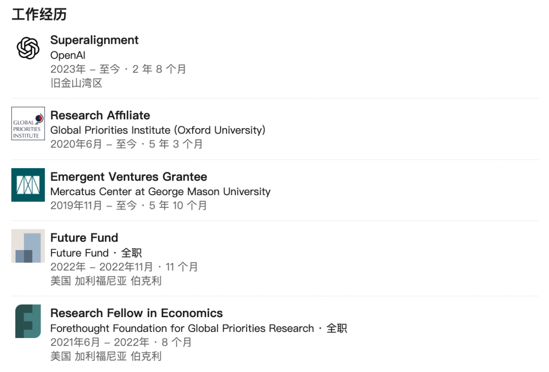 毕业后,他在牛津大学的全球优先事项研究所从事长期经济增长研究,并参与了有效利他主义运动。 他曾在 FTX Future Fund 工作,专注于 AI 安全和全球风险管理。