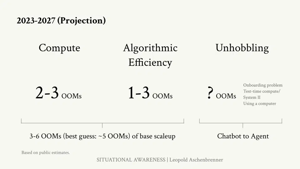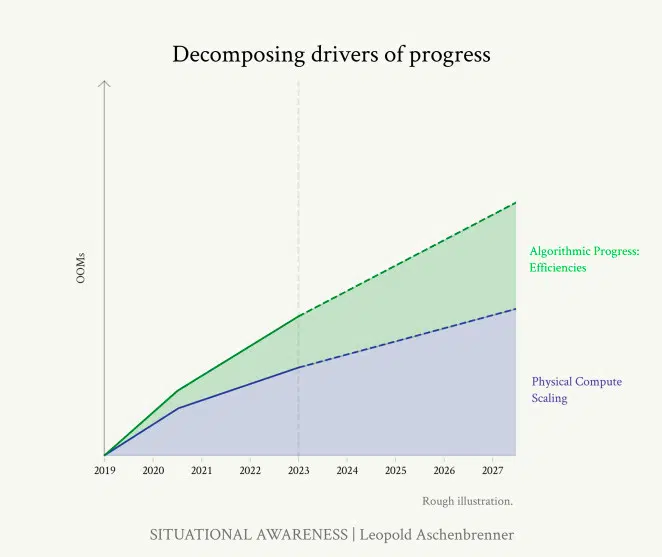 Leopold Aschenbrenner 强调了到 2027 年实现通用人工智能(AGI)的可能路径。他认为,在业界持续投入算力,提升算法效率的前提下,我们或许能够让 AI 系统在众多领域上与人类智力匹敌,甚至超越人类。