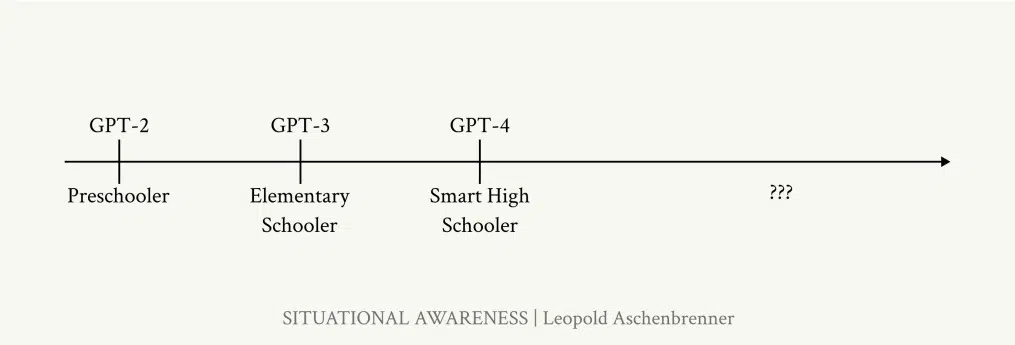 在文章中,作者探讨了近年来 AI 能力的指数级增长,尤其是 GPT-2 到 GPT-4 出现的过程。Leopold Aschenbrenner 强调,这是一个快速进步的时代,人工智能从完成非常基础的任务发展到拥有更复杂、类似人类的理解和语言生成能力。