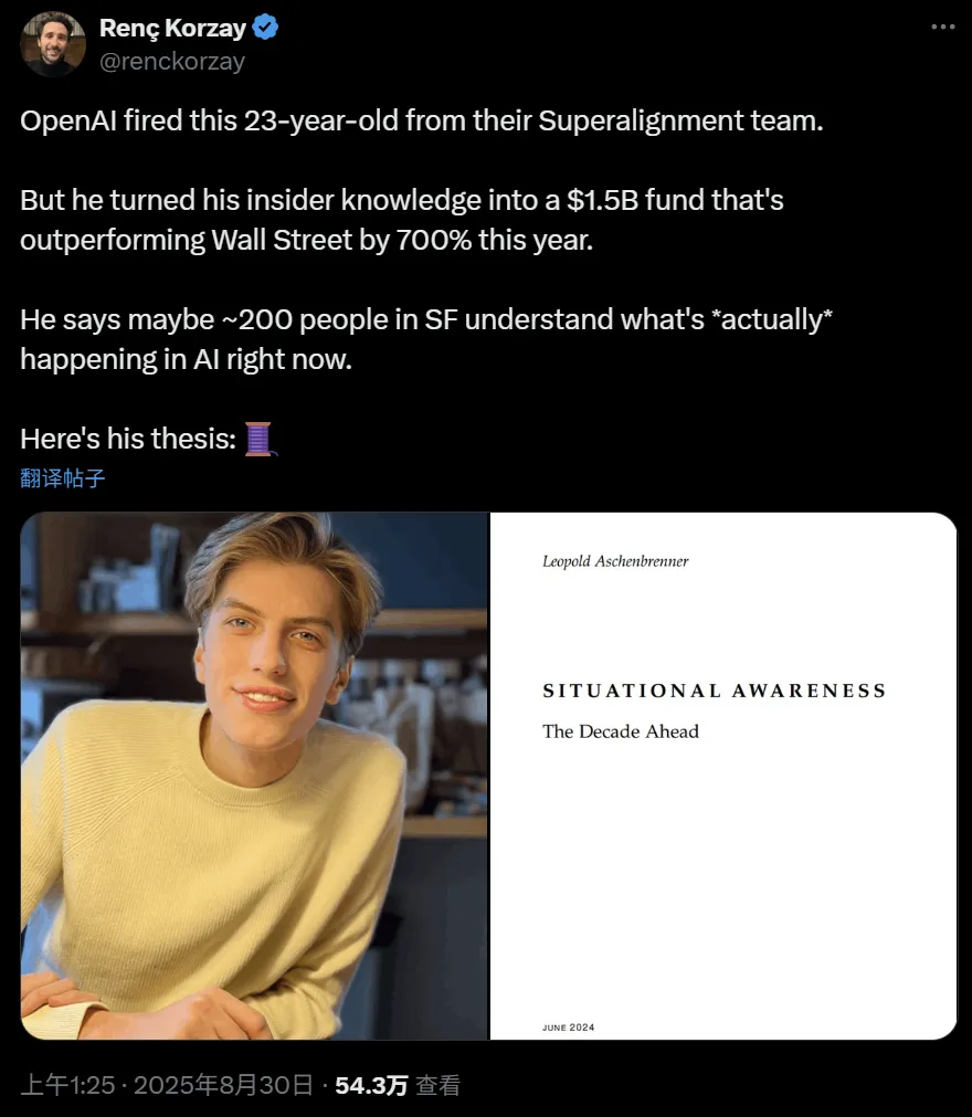 转头,这小哥就扎进投资领域,创建了名为 Situational Awareness 的对冲基金。