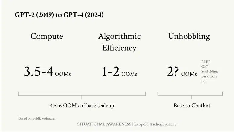 「数量级」(Orders of Magnitude,即「OOM」)的概念对于讨论至关重要。Aschenbrenner 使用数量级(OOM)来评估 AI 能力、算力和数据消耗的进步,OOM 指给定指标的十倍增长。就计算能力和数据可扩展性而言,从 GPT-2 到 GPT-4 的转换代表了许多 OOM。