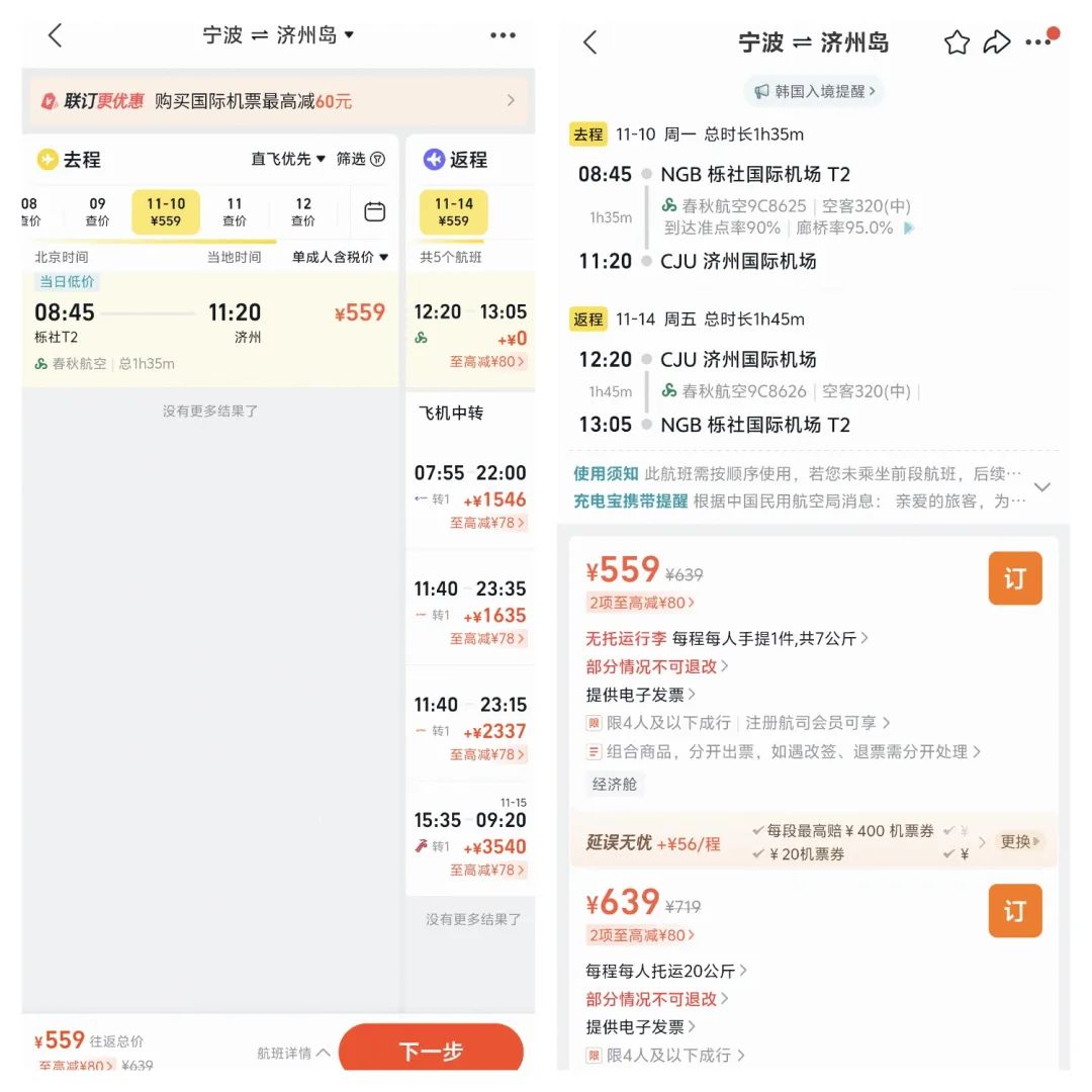 宁波=济州岛,11月10日-11月14日,往返含税559元,不含托运行李。