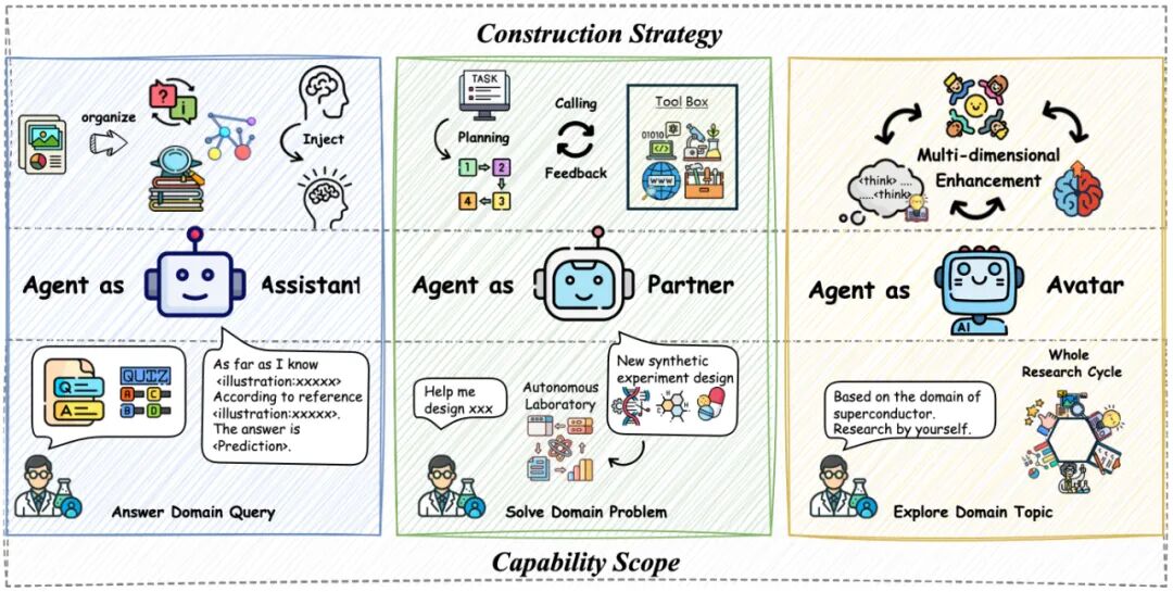文章首先提出了科研智能体的三级分级策略:从专注于单一任务的“Agent as Assistant”,到能集成工具处理多任务的“Agent as Partner”,再到具备强大推理、深度记忆和跨学科协作能力的“Agent as Avatar”。这一分级不仅明确了不同智能体的能力边界,也指明了其构建策略的侧重点。