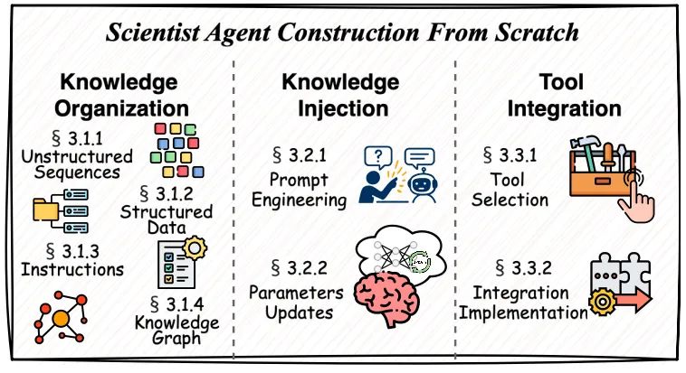 本综述凝练了科研智能体的构建过程,从头构建科研智能体的工作流主要为知识组织、知识注入以及工具集成三个部分构成。