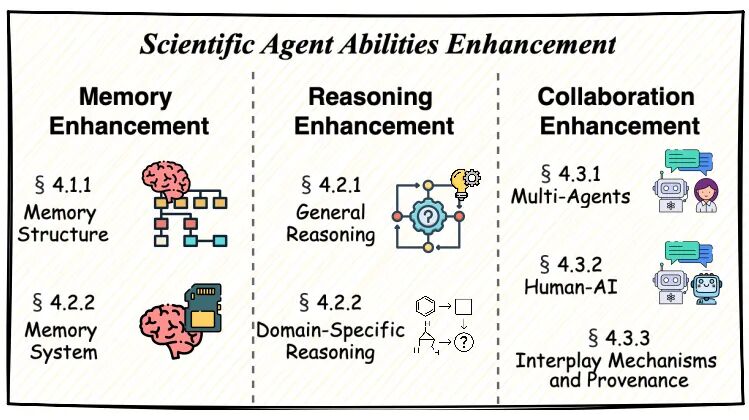 为了进一步提升科研智能体的性能,文章还探讨了多种能力增强策略,如**记忆增强**(通过不同的记忆结构和系统实现长期高效运作与多步推理),**推理增强**(利用链式思考CoT、自洽性验证、领域偏好等提升推理的准确性和可靠性),以及**协作增强**(优化多智能体系统内部沟通与智能体与人类之间的交互,实现角色专业化和知识共享)。