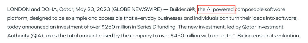 Builder 的第四轮融资(也是最后一轮)由主权财富基金卡塔尔投资局(QIA)领投,时间在 2023 年。这一次,新闻报告中紧跟公司名称的第三个词就是“AI”。