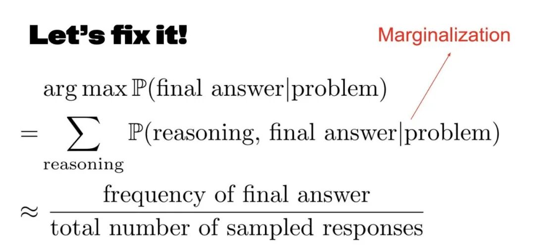 对我们来说,需要选择概率最大的答案。所以它们没有对齐,我们只需要再进一步。如果我们生成推理过程,我们应该有一些整体推理过程来找出最终答案在机器学习方面的概率,这被称为边缘化。所有这些原因实际上本质上都只是潜在变量。如果我们刚开始接触机器学习,实际上就会知道这个和可以通过采样来计算。