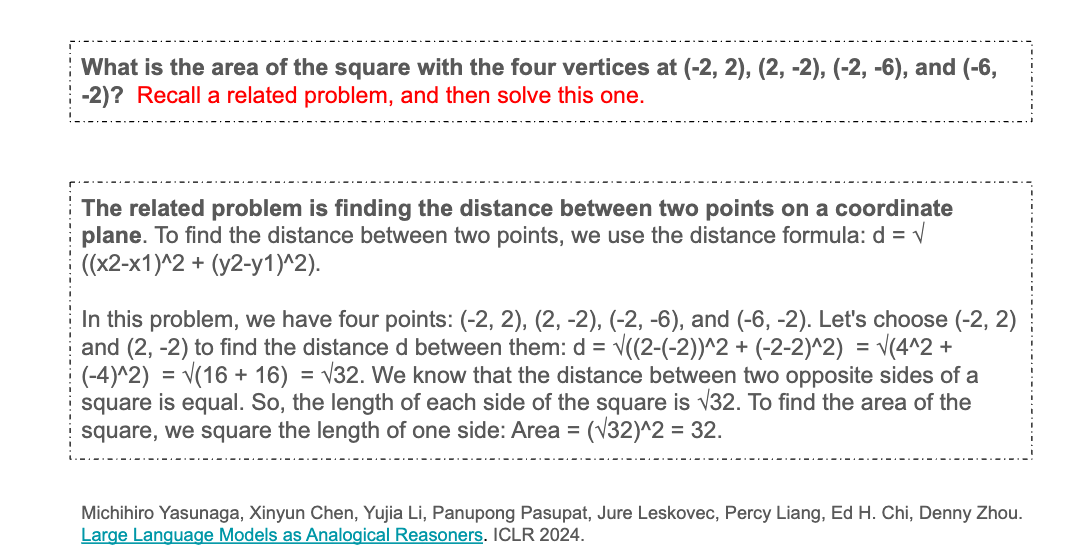 考虑这样一个问题:一个正方形的四个顶点的坐标是…… 那么它的面积是多少?这个红色高亮部分是我添加的提示:「回忆一个相关的问题,然后解决这个问题。」