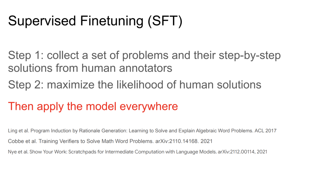 实际上思路非常简单,我们可以从人工标注者那里收集一系列问题及其逐步解决的方案,然后我们最大化人类解决方案的可能性,标记一些实际上用于 LLM 训练的网络代码。在那之后,我们就可以在任何地方应用这个模型。Denny Zhou 等人在 2017 年的一系列研究中展示了这种能力,他们收集了大量文字问题及人工标注的解决方法。在 2021 年,这一方法被用来解决大规模问题,随后 OpenAI 扩展了这一方法。