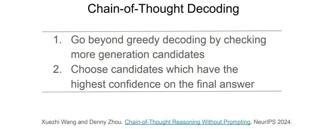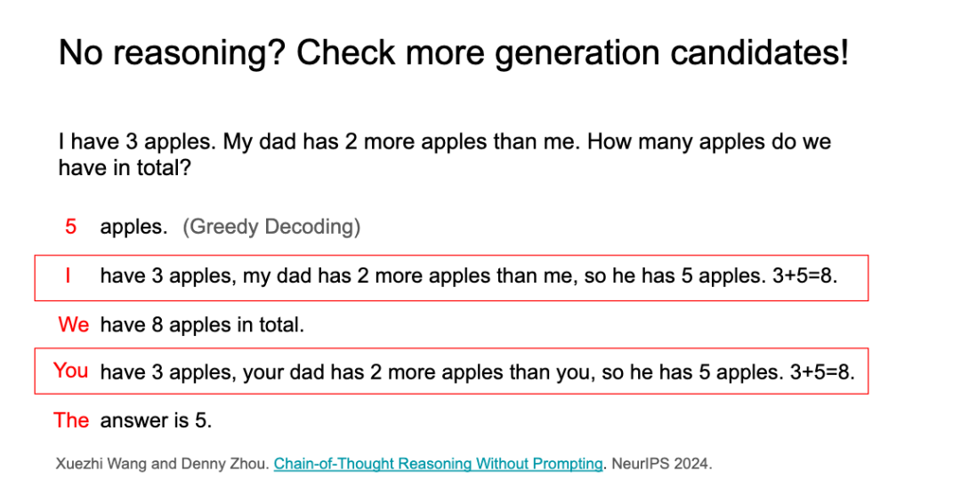 这是因为使用了「贪婪解码」方法,模型直接输出最可能的答案。但是,如果我们多考虑一些候选答案,而不是只选择一个最可能的候选答案,模型就能产生一个更正确的答案,这就是「链式推理解码」的概念。