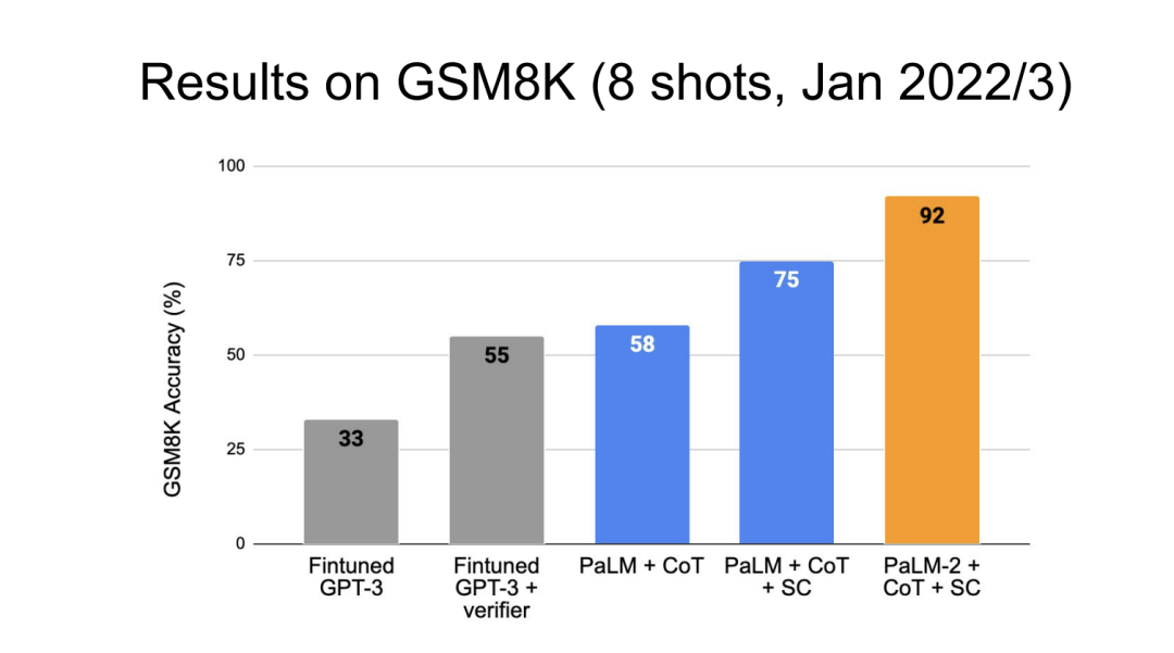 这些提示方法确实非常简单,而且效果也非常好,但我们也能看到一些问题,例如安全提示方法就需要任务特定的示例。而另一个方法叫做「逐步思考」,它是一个通用的方法。你不需要找到类似的示例,只需说「让我们一步步思考」,然后奇迹般的结果就会出现。不过,它的表现比少量示例的提示差得多。