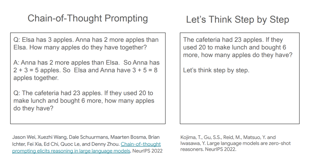 虽然这两种方法看起来都不错,但「逐步思考」方法有些怪。如果我问某人一个问题,然后要求他们跟我一步步思考,否则他们就无法继续思考,这显然不符合我们的期望。