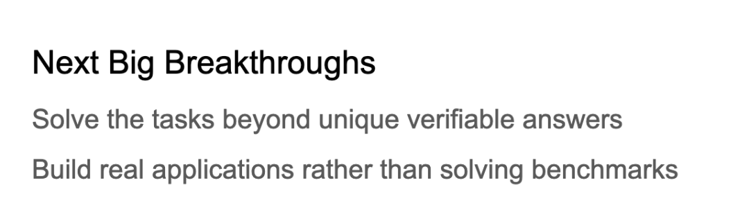 对于未来的突破,Denny Zhou 表示,他非常期待看到如何解决那些超出唯一、可验证答案的任务。他认为,基准测试很快会趋于饱和,更多的研究应该集中在构建真正的应用程序上,而不仅仅是解决学术性基准测试问题。