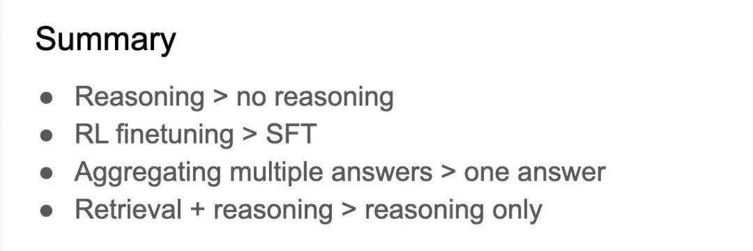 文章还深入探讨了中间Token在推理中的关键作用,及其如何让固定大小的Transformer有效解决复杂问题。同时,揭示了从监督微调(SFT)到依赖机器生成数据进行自我提升,再到RL finetuning的技术演进路线。Denny Zhou强调,RL finetuning通过直接优化目标指标,实现了更优的泛化能力。此外,他还指出,检索与推理的结合,能显著提升LLM在解决复杂问题上的性能。他总结道:推理总比不推理好,RL finetuning优于SFT,聚合多答案优于单一答案,而检索与推理结合则更佳。面对未来,研究应聚焦于超越单一、可验证答案的实际应用构建。