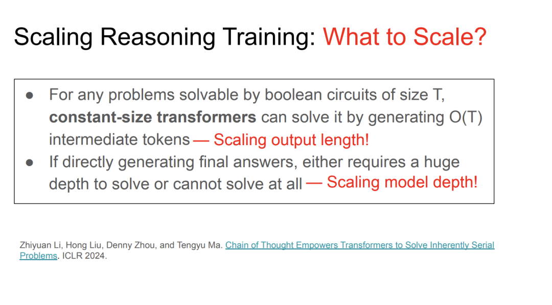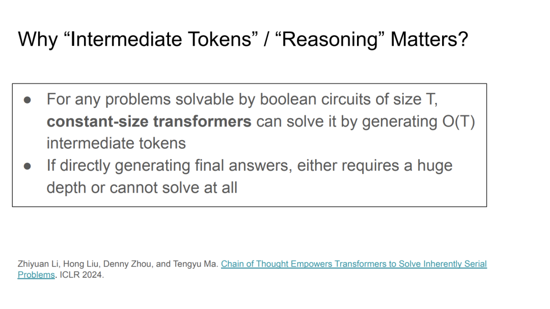 这个理论表明,逻辑电路的大小(即电路中逻辑门的数量)决定了解决问题的能力。比如,使用 GPU 集群时,逻辑门的数量可能达到数千万、数十亿甚至数万亿。如果直接生成最终答案,可能需要极深的模型结构,甚至无法解决问题。而通过生成中间 token,模型就能以恒定大小的 transformer 架构有效地解决问题。这种思路提供了一种从理论角度理解推理的方式。
