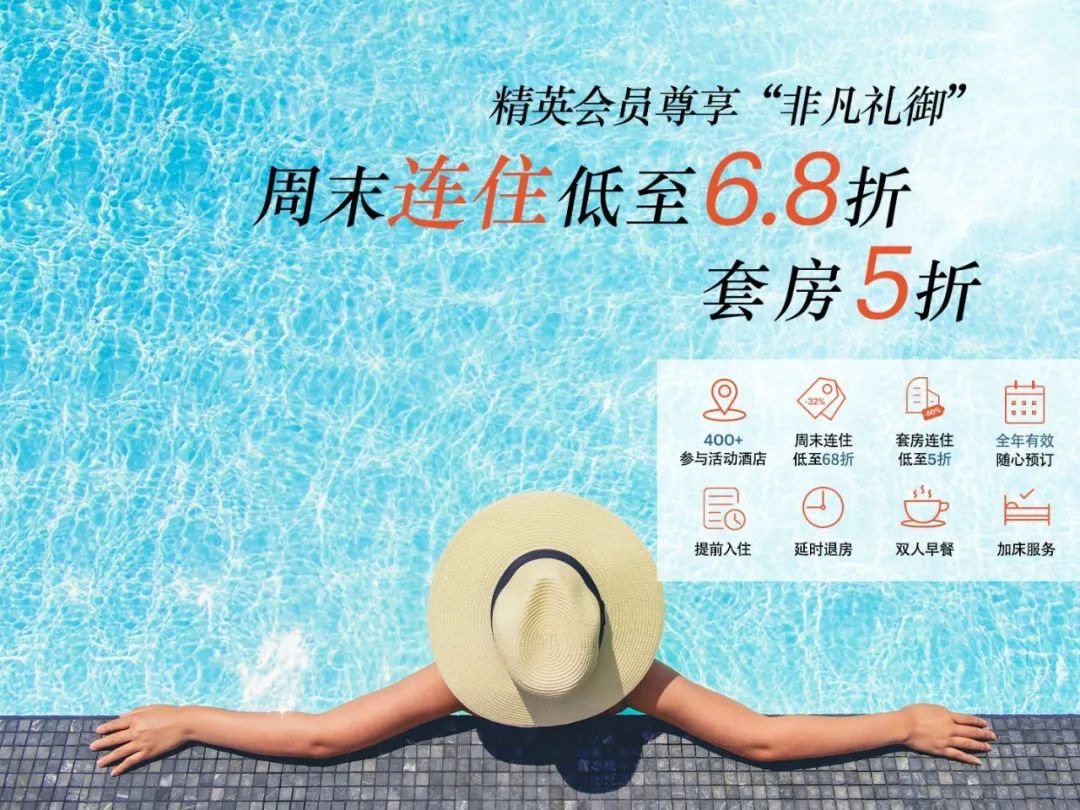 预定参与活动的酒店,周末的房晚,可享标准含早价格(含早 BFR 价)基础上的一晚 8 折,连住两晚可享 68 折。 -