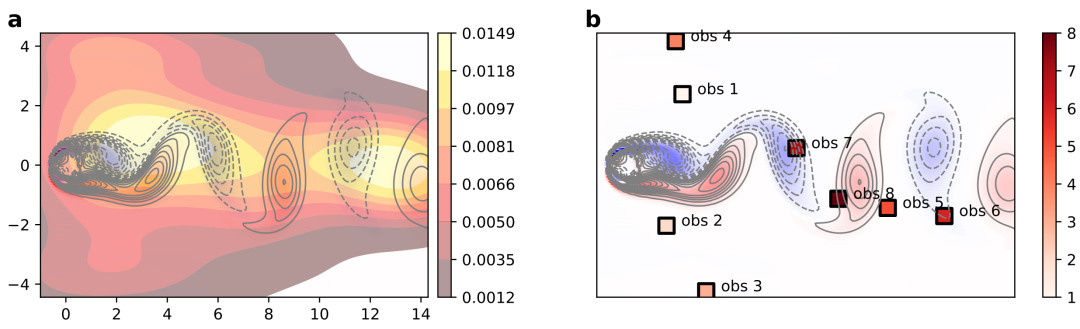 论文开展了一系列针对不同传感器数量、训练数据规模和噪声水平场景下的实验,典型数值案例实验结果如表1所示。在不同条件下,采用DSPO的Baseline模型和SOTA模型均显著优于固定传感器布局方案。 DSPO通过动态传感器布局优化能够有效提升模型性能,在减少传感器数量和训练数据需求的同时获得较高的重建精度,节省经济成本与计算资源。如表中加粗结果所示,通过DSPO增强的Baseline模型性能可接近甚至达到SOTA模型水平,表明DSPO能够突破既定网络架构对精度的固有限制,使得网络架构在满足任务需求的同时仍保持较高重建精度。图2展示了不同初始布局下优化后的传感器分布热图与代表性布局的重要性排序,尽管初始布局具有随机性,但大多数优化后的传感器布局一致地收敛于尾流区域附近,这一结果突显了 DSPO 在识别流场中高信息增益区域的能力。