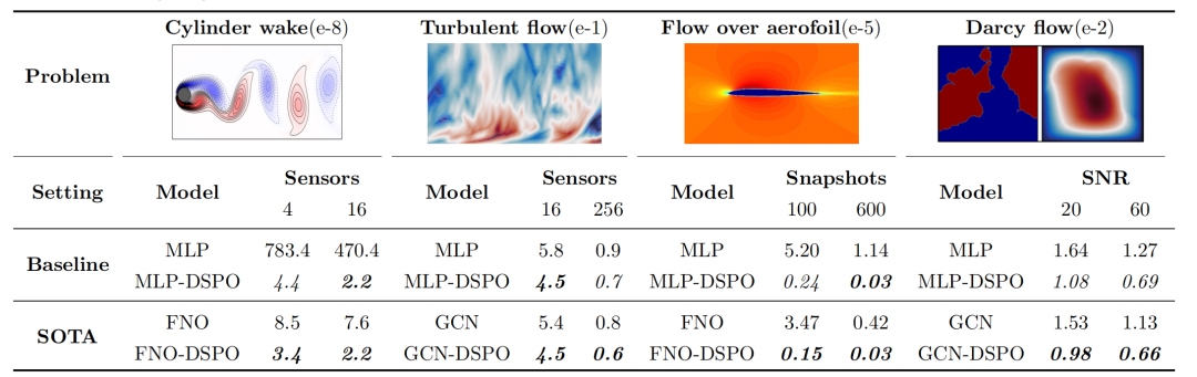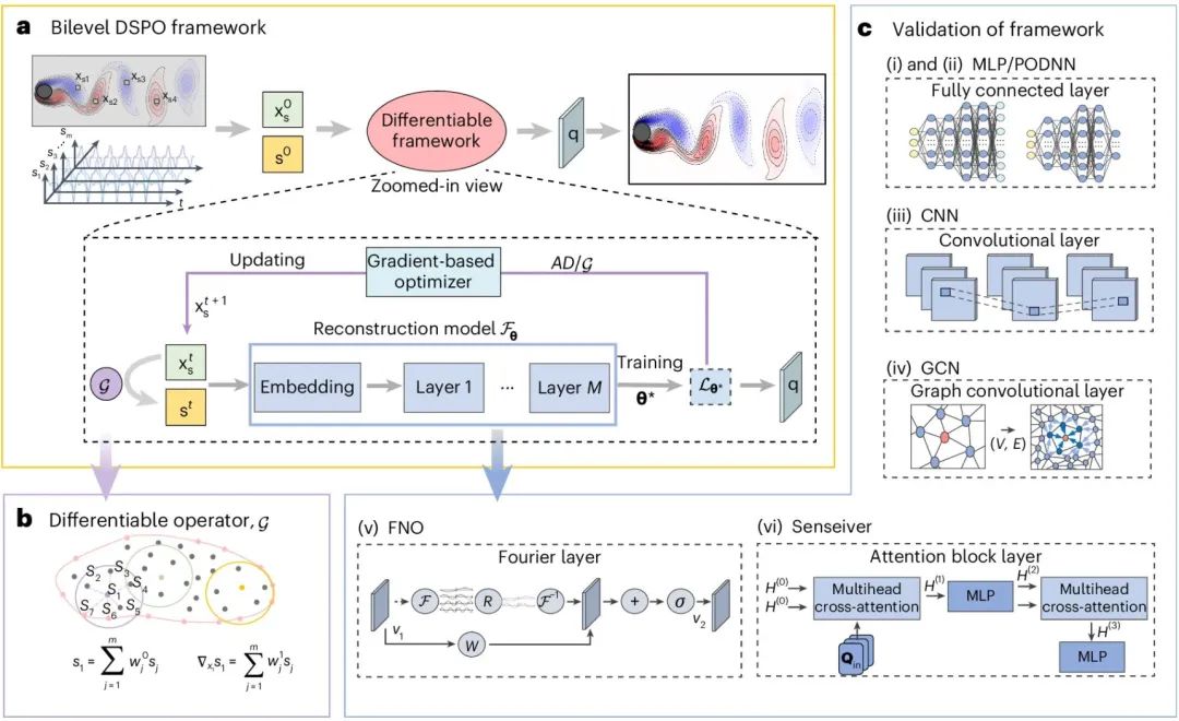传感器布局优化需要耦合嵌套重建模型训练与精度评估,其本质是双层优化问题,利用启发式优化代价高昂;梯度优化可利用较少迭代实现快速收敛,但缺少重建误差到传感器布局的梯度信息传递机制,导致梯度算法难以适用。针对以上问题,研究团队提出了一个新颖的双层可微学习框架DSPO,融合深度重建训练与传感器布局优化,实现高精度的全局物理场预测。该框架具有三大核心贡献: