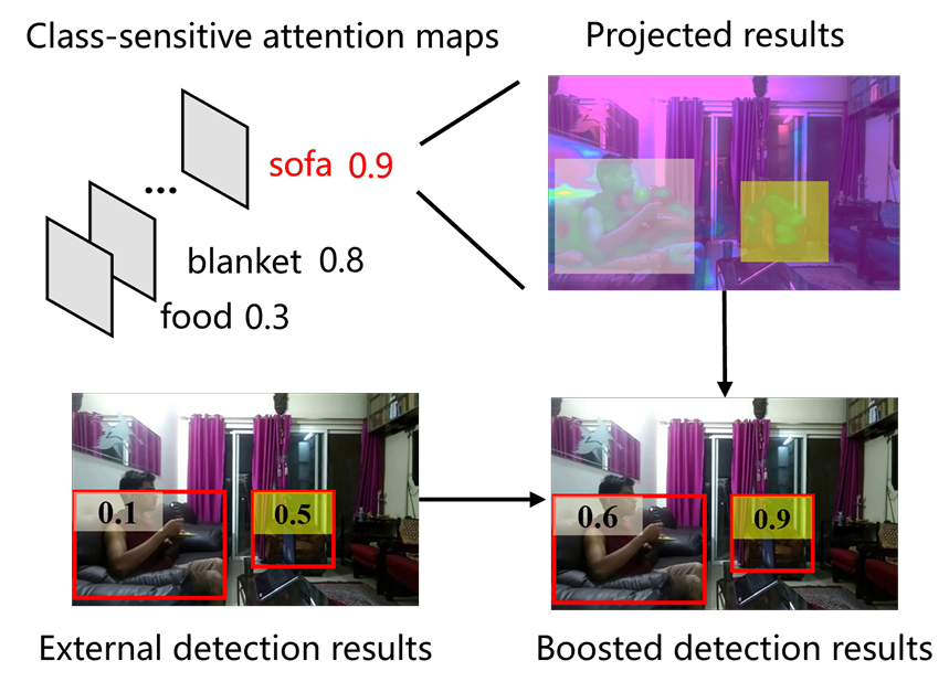 与外部检测注意力图 Aext 结合,并进行归一化操作,生成增强的类别 ci 的注意力图,得到改进的物体检测结果 D2,从而缓解可能的漏检问题: