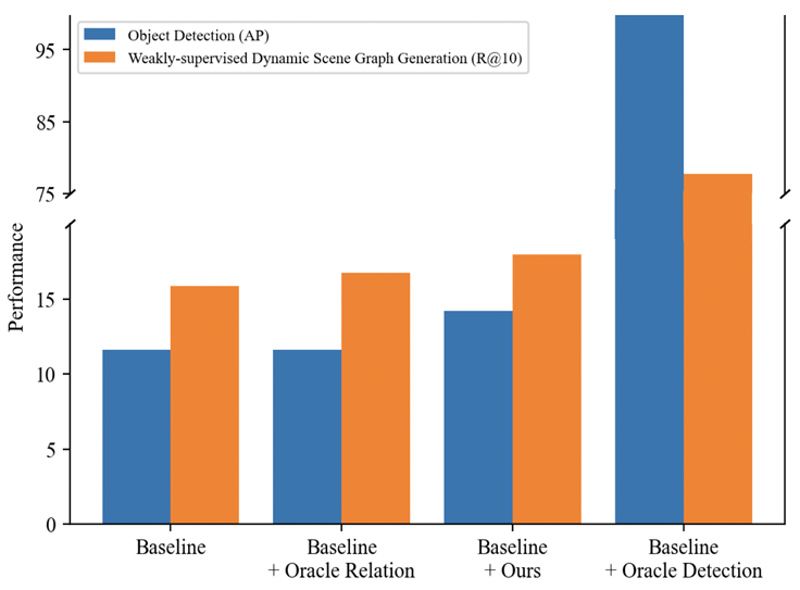 然而,在动态、关系感知的动态场景图生成场景中,训练于静态、以物体为中心图像上的目标检测器可能出现物体定位不准确以及对部分物体置信度过低,从而导致物体漏检的问题。本文通过分析目标检测结果和关系预测结果对最终场景图质量的影响(如下图 1 所示),可以发现目标检测质量是目前弱监督动态场景图生成任务的主要瓶颈。