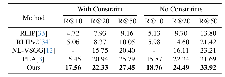 我们对比了两大类方法,第一类是已有最优的弱监督动态场景图生成方法,包括 PLA [1] 和 NL-VSGG;第二类是擅长关系理解的视觉语言模型,包括 RLIP 和 RLIPv2 [4]。