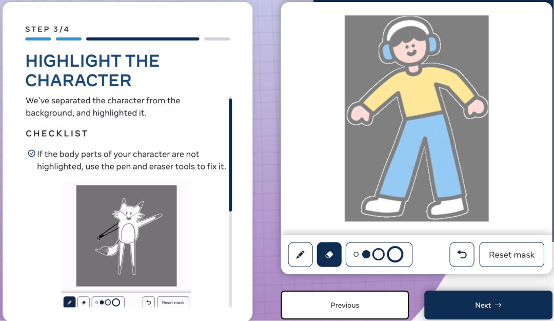 然后,AI 自动分离角色与背景,如果 AI 无法正确识别,我们还可以用「钢笔」和「橡皮擦」按钮手动微调;若是胳膊、腿粘在一起,也使用橡皮擦工具将它们分开。