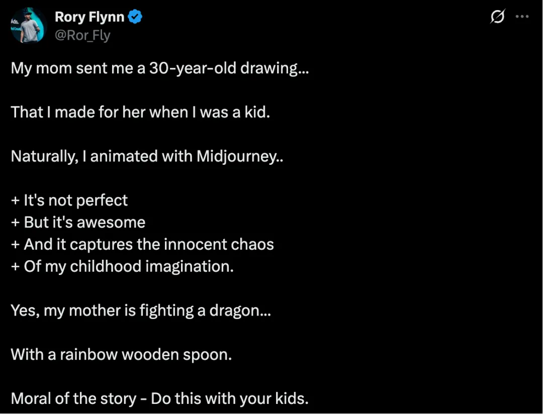 前段时间,博主 Rory Flynn 在 X 上发了个帖子,说他妈妈发来一张 30 年前的涂鸦画,他反手就用 Midjourney 做成了「妈妈拿彩虹木勺大战巨龙」动画。