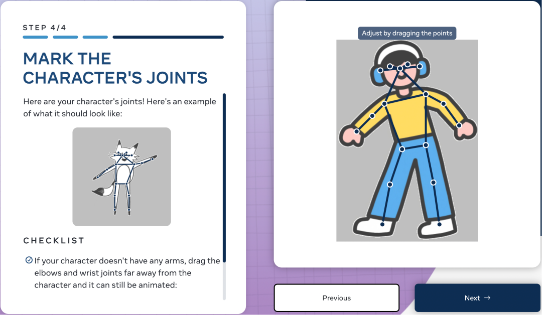标记角色关节,方便下一步通过运动捕捉数据制作动画。如果角色没有胳膊,则将肘部和腕部的关节点拖远,它仍然可以制作动画。