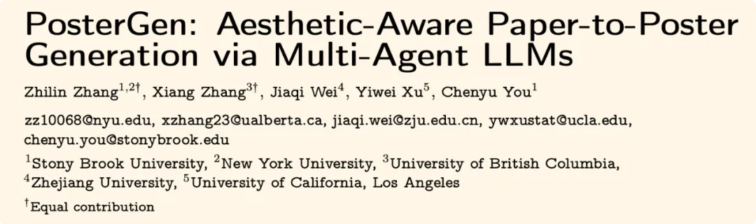 为解决这一痛点,来自纽约州立大学石溪分校、纽约大学、不列颠哥伦比亚大学和浙江大学的联合团队推出了 PosterGen,一个能将论文 PDF 直接转化为设计精良、完全可编辑的 PPTX 格式学术海报的多智能体框架。