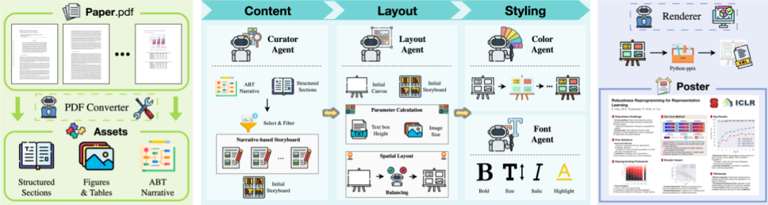 PosterGen 的工作流由四个协同工作的专业智能体(或模块)构成,系统性地将设计原则贯穿于海报生成的每一个环节,环环相扣、各司其职,让学术海报的自动化生成拥有了接近人类设计师的「审美与灵感」。