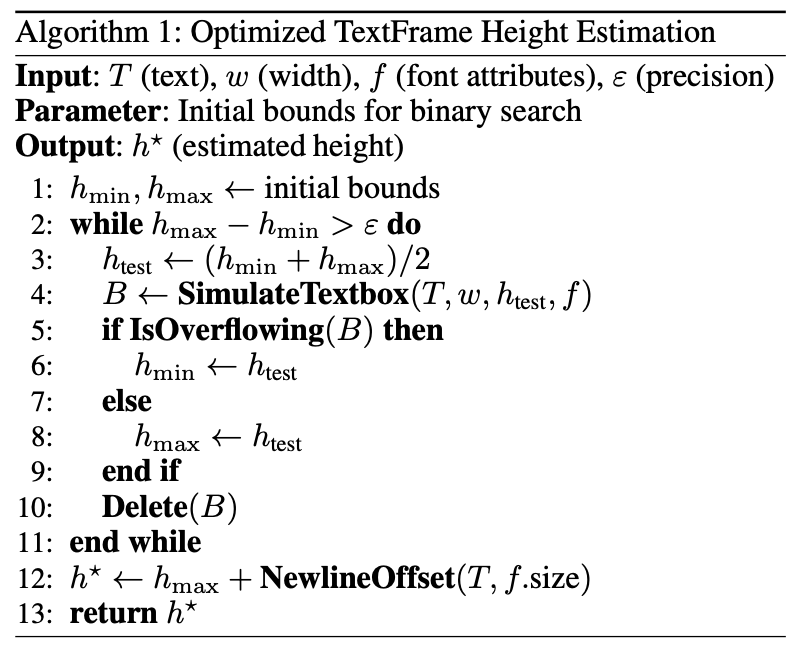 由于不同系统的渲染引擎的差异,精确计算文本框的高度是 PPTX 自动化布局中的一个核心挑战。为此,研究团队提出了一种优化的估算算法,该算法通过二分搜索来确定避免字体大小被自动缩减的最小文本框高度,并结合换行符进行偏移校正,以精准预测最终渲染高度,从而有效避免了令人头疼的内容溢出与浪费空间。
