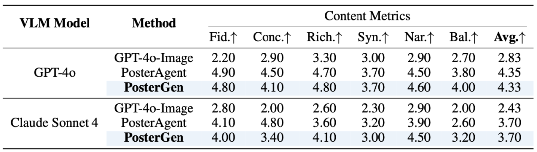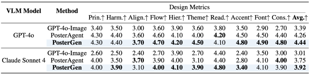 为了证明 PosterGen 的「美学驱动」确实有效,研究团队引入了一套基于视觉语言模型(VLM)的综合性评估标准(VLM-as-Judge),从内容和设计两大维度对生成结果进行评分。