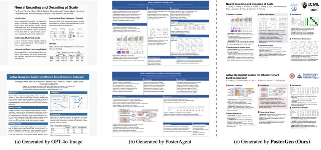 最后,Renderer 模块将所有风格与布局信息精准落地,并调用 python-pptx 库生成完全可编辑的 PPTX 格式的学术海报,并自动生成高分辨率的 PNG 图像,供用户查阅和使用。生成的结果能够直接用于学术会议现场,达到演示级别的水准。