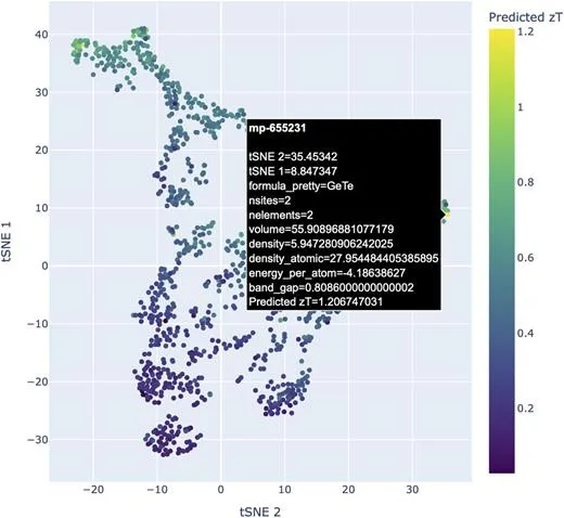该图谱包含热电性能(zT)和结构相似性的坐标轴,每个数据点代表一种材料。在这个图谱上,结构相似(即相似)的材料出现在邻近位置。这样的分布可以引导研究人员找到特定情况下正确的材料——而无需浪费时间迷失方向。