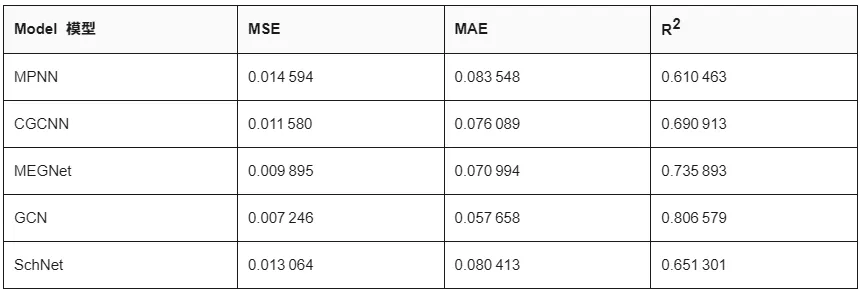 表 1:各种基于图架构的材料属性预测性能。